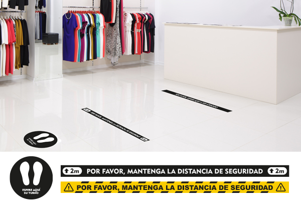 RUVA SEGURIDAD ofrece otra solución los vinilos de distancia de seguridad y señalización para suelos. Se pueden pegar en todo tipo de suelos y ofrecen una excelente durabilidad. Su uso principal es poder conseguir que mantenga la distancia de seguridad de al menos 1 metro y medio en las colas de tu negocio o empresa, y así evitar el contagio del virus.